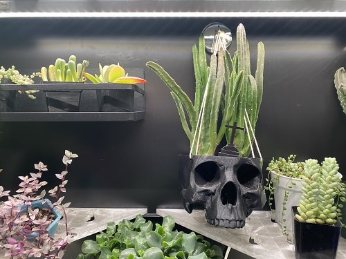 Below, you can see the Hoopoton magnetic IKEA greenhouse shelves in my Lovecraft & Death Rudsta greenhouse below. I use them to place small succulents close to the grow lights. The baby toes and string of pearls have bloomed like crazy!